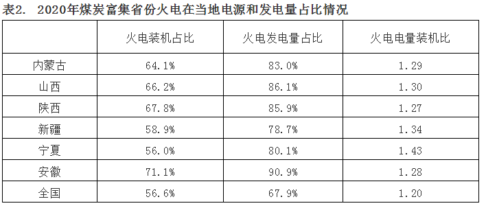 表2. 2020年煤炭富集省份火電在當(dāng)?shù)仉娫春桶l(fā)電量占比情況