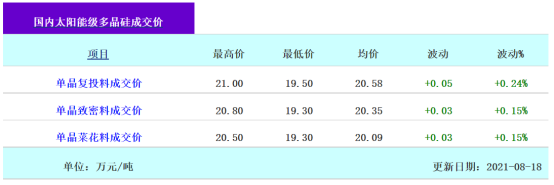 本周多晶硅價格基本穩定,散單成交價漲幅在1元/kg左右,對產業鏈成本的影響不大。硅業分會介紹,絕大多數硅料企業訂單基本已簽至8月底甚至9月上旬,本周新簽訂單多為散單和補單。此外,下游訂單需求較為穩定,傳導至上游,可以支撐硅片環節開工率提升,價格也有所回升,硅料需求持續向好。
