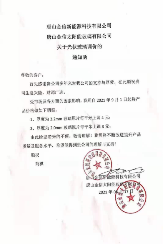 8月17日,唐山金信太陽能玻璃有限公司發布調價通知函,自9月1日起,3.2mm光伏玻璃原片每平米上調4元,2.0mm光伏玻璃原片每平米上調3元。