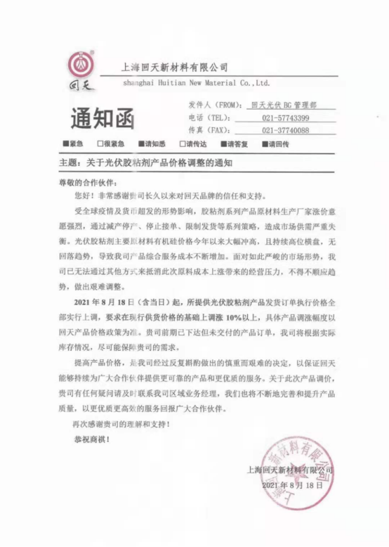 今日,回天新材發布《關于光伏膠粘劑產品價格調整的通知》,宣布漲價10%以上。