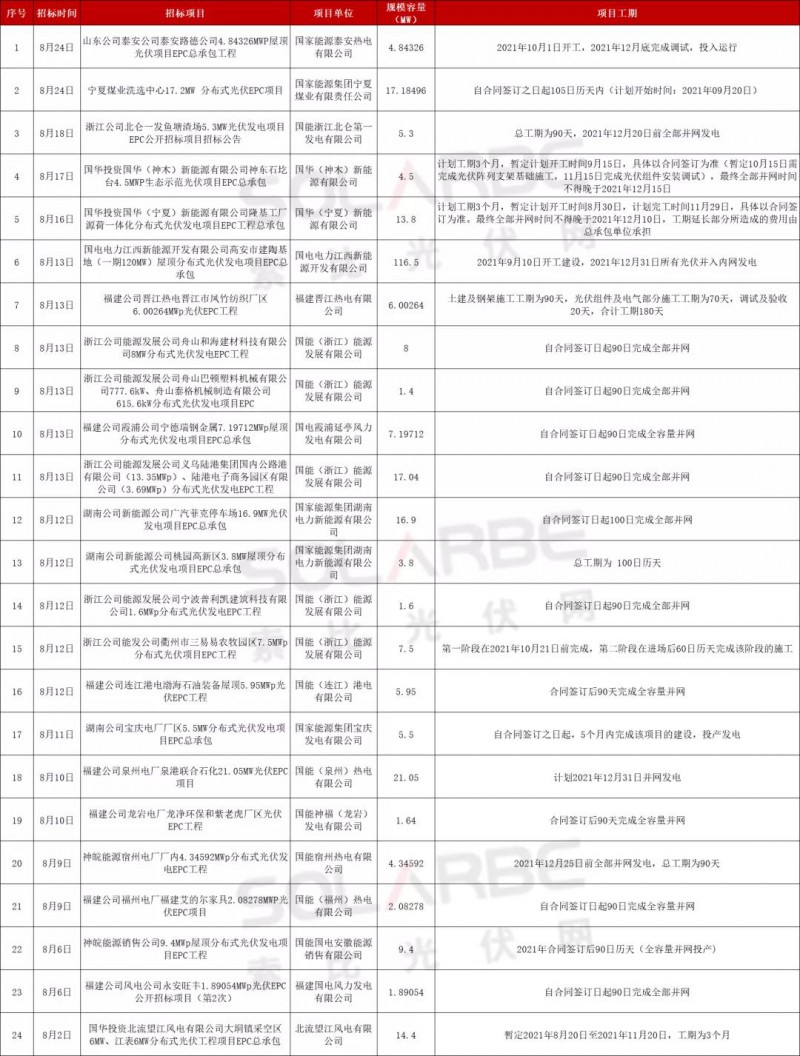 據索比光伏網統計,國家能源集團在8月份發布了24個分布式光伏項目EPC招標,裝機容量合計300MW,大多要求年底前并網。