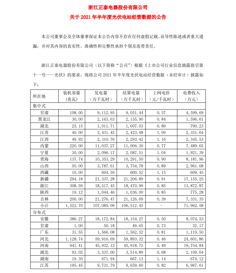 持有電站6.55GW!正泰電器發(fā)布關(guān)于2021半年度光伏電站經(jīng)營數(shù)據(jù)的公告