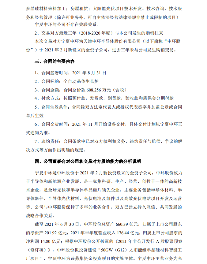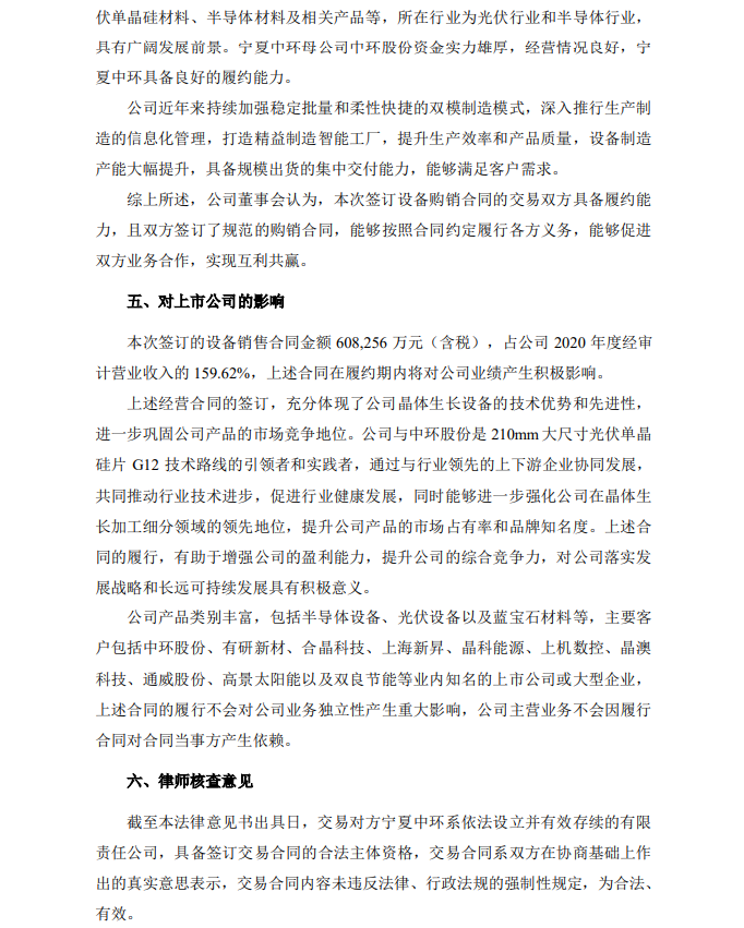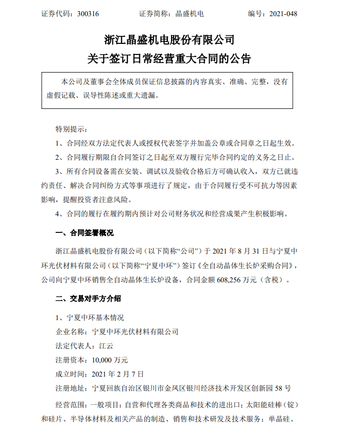 晶盛機電稱,本次簽訂的設備銷售合同金額占公司 2020 年度經審計營業收入的 159.62%,合同在履約期內將對公司業績產生積極影響。本次合同的簽訂,充分體現了公司晶體生長設備的技術優勢和先進性,進一步鞏固公司產品的市場競爭地位。公司與中環股份是 210mm大尺寸光伏單晶硅片 G12 技術路線的引領者和實踐者,通過與行業領先的上下游企業協同發展,共同推動行業技術進步,促進行業健康發展,同時能夠進一步強化公司在晶體生長加工細分領域的領先地位,提升公司產品的市場占有率和品牌知名度。上述合同的履行,有助于增強公司的盈利能力,提升公司的綜合競爭力,對公司落實發展戰略和長遠可持續發展具有積極意義。