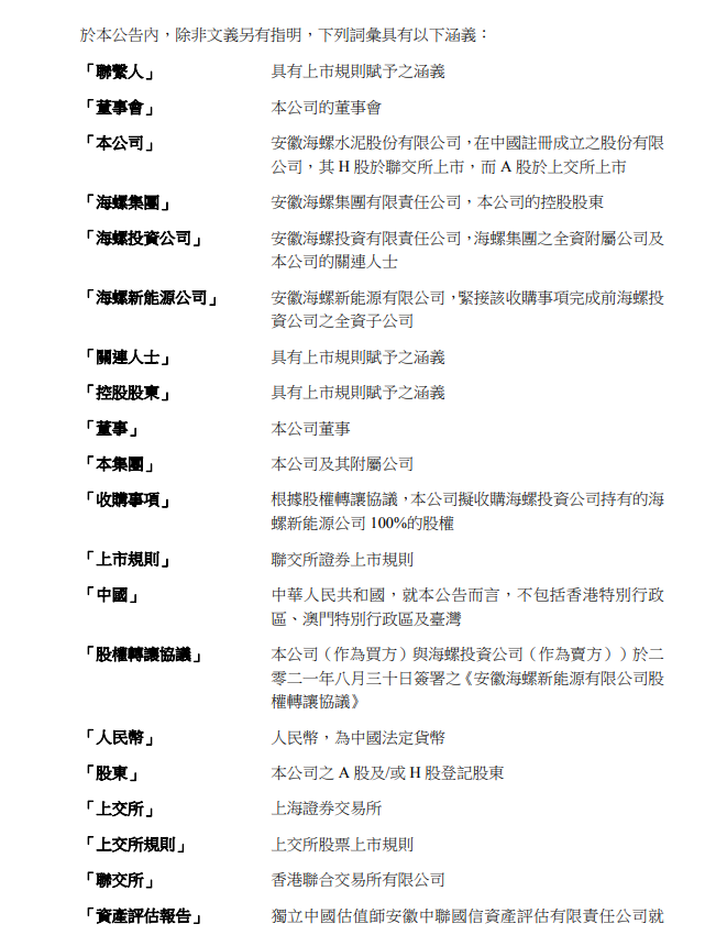 據(jù)悉,海螺新能源公司是一家于二零一八年三月在中國注冊成立的有限責(zé)任公司,于本公告日期之注冊資本為人民幣5億元,主要經(jīng)營范圍包括:光伏發(fā)電、風(fēng)力發(fā)電、儲能系統(tǒng)領(lǐng)域內(nèi)的技術(shù)開發(fā)、技術(shù)服務(wù),電力項目的建設(shè)、運營和管理,電力銷售、電力工程、機電工程施工等。根據(jù)資產(chǎn)評估報告,海螺新能源公司于二零二一年六月三十日的資產(chǎn)凈值為人民幣 49437.59 萬元。