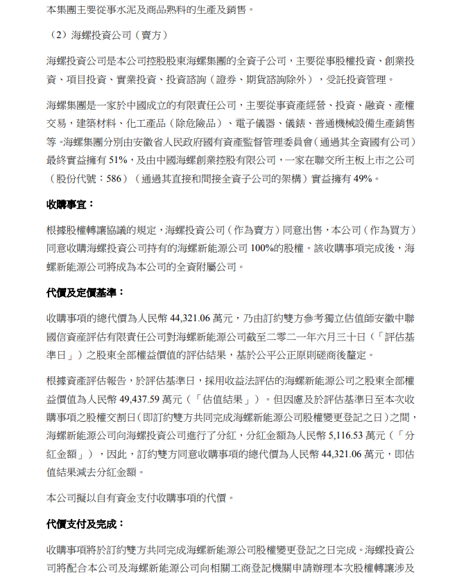 公告中提到,海螺水泥決定收購海螺新能源公司主要基于考慮以下原因及預(yù)計可從交易獲得的益處: