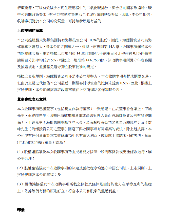 清潔能源,可以有效減少水泥生產(chǎn)過程中的二氧化碳排放,契合當(dāng)前國家碳達(dá)峰、碳 中和有關(guān)政策要求,有利於推動本集團乃至水泥行業(yè)的轉(zhuǎn)型升級。因此,本公司相信, 收購事項對於本公司的高質(zhì)量、可持續(xù)發(fā)展是有益的。