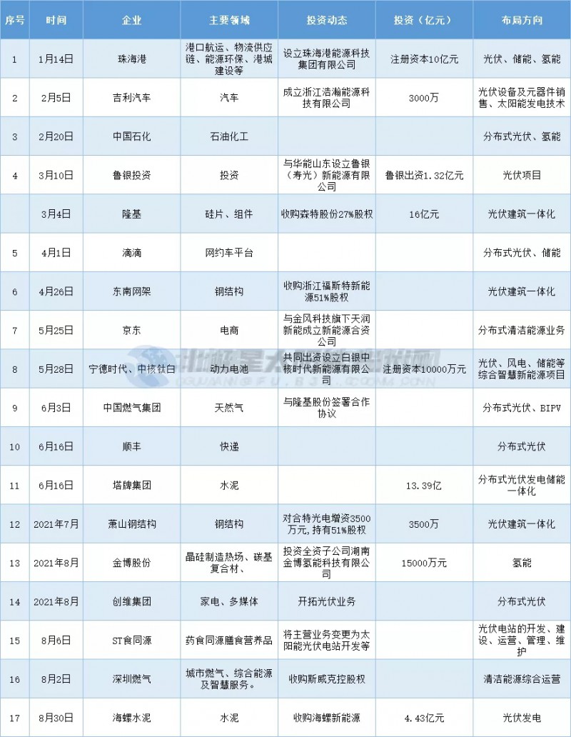 這些企業(yè)中,不乏有如電商巨頭京東、滴滴,快遞巨頭順豐,更有水泥大佬塔牌集團、海螺水泥;鋼結(jié)構(gòu)龍頭東南網(wǎng)架、蕭山鋼結(jié)構(gòu);鞋業(yè)大王寶峰時尚,家電龍頭創(chuàng)維集團;更有中石化、深圳燃氣等傳統(tǒng)能源企業(yè)涌向光伏行業(yè)。