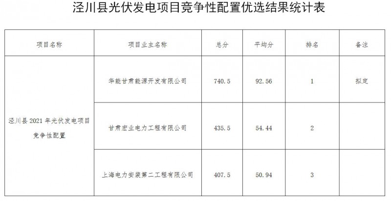 涇川縣2021年光伏發電項目競爭性配置工作優選結果公示