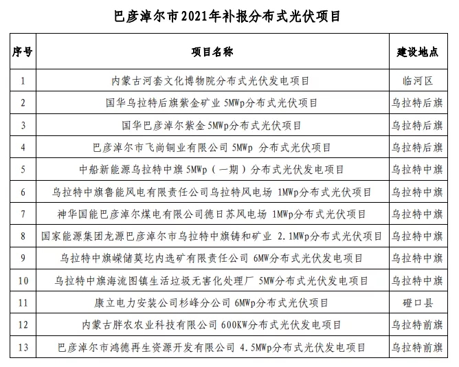 關于對2021年巴彥淖爾市補報 分布式光伏項目競爭優選結果的公示