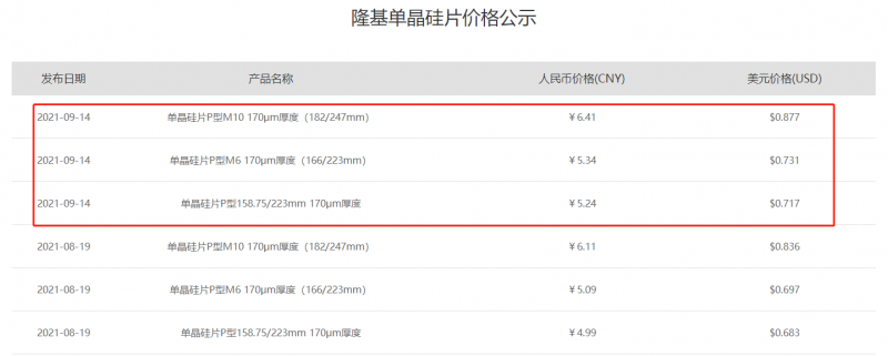 G1、M6漲0.25元,M10漲0.3元!隆基最新硅片價(jià)格公示