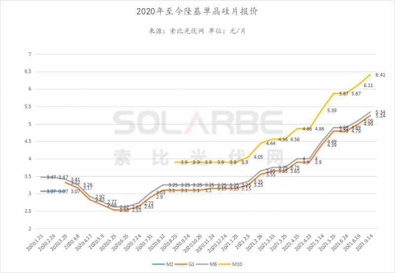 M10(182mm)報(bào)價(jià)6.41元/片,較上月上漲0.3元/片。