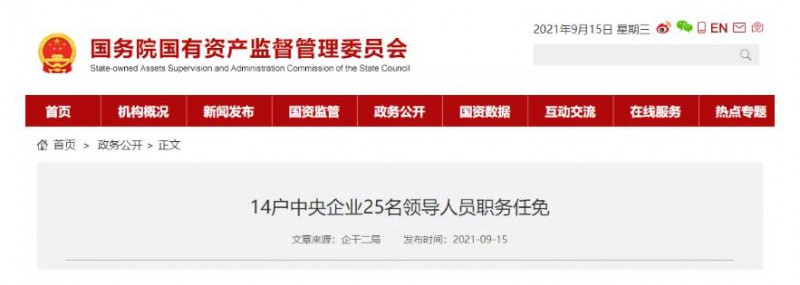 9月15日,國資委發布14戶中央企業25名領導人員職務任免公告,其中對中國電力建設集團有限公司領導人員職務調整如下: