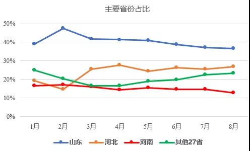 值得注意的是,戶用光伏裝機(jī)規(guī)模最大的三個省:山東、河北、河南近4個月的裝機(jī)環(huán)比變化不大,因此在全國市場中的占有率持續(xù)走低,如下圖所示。但8月份占比仍高達(dá)76.5%。