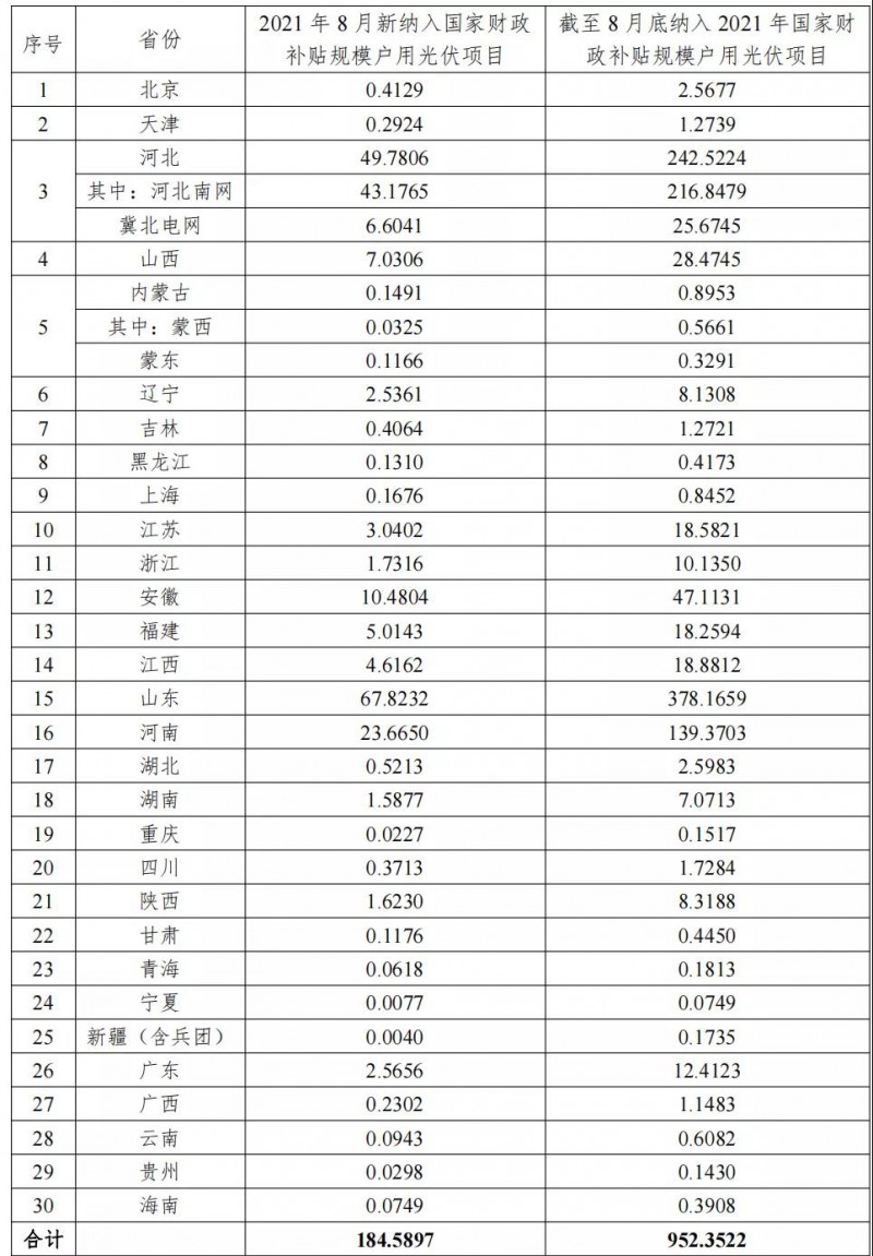 根據(jù)各省級能源主管部門、電網(wǎng)企業(yè)報送信息,經(jīng)國家可再生能源信息管理中心梳理統(tǒng)計(jì),2021年8月新納入國家財政補(bǔ)貼規(guī)模戶用光伏項(xiàng)目總裝機(jī)容量為184.59萬千瓦。截至2021年8月底,全國累計(jì)納入2021年國家財政補(bǔ)貼規(guī)模戶用光伏項(xiàng)目裝機(jī)容量為952.35萬千瓦。詳細(xì)情況見附表。