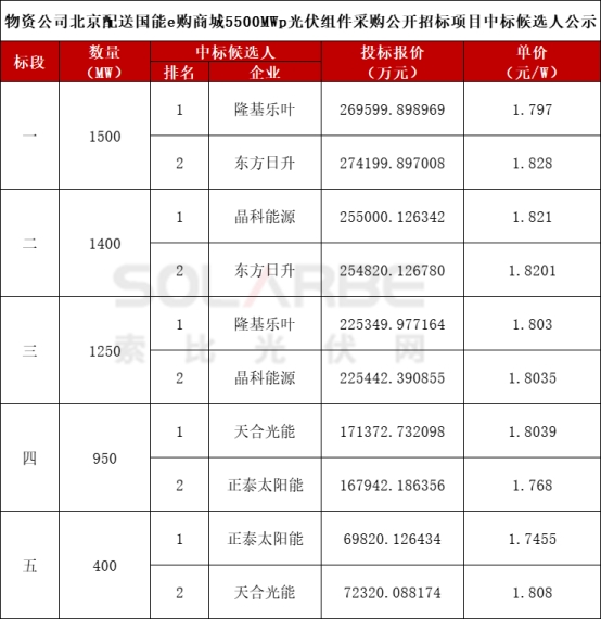 根據中標公告,隆基樂葉當選第一、三標段中標候選人第一名,中標規模2.75GW。第一標段中標單價1.797元/W,本標段530Wp及以上大尺寸組件占比達87%,其中雙面大尺寸占比62%;