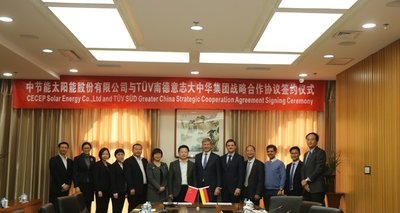 北京2017年3月13日電 /美通社/ -- 近期,TUV南德意志集團(以下簡稱“TUV SUD”)與中節能太陽能股份有限公司(以下簡稱“中節能”)達成“戰略合作關系”,并現場簽署了戰略合作協議。中節能太陽能股份有限公司董事長曹華斌先生,TUV SUD管理委員會主席施特克芬教授(Prof. Dr.-Ing. Axel Stepken),TUV SUD大中華集團總裁兼首席執行官范華德先生(Mr. Dirk von Wahl),TUV SUD大中華集團高級副總裁兼北區董事總經理朱文才先生等出席了簽約儀式。經雙方確認,將在光伏組件檢測與認證業務、光伏電站測試、全過程質量控制與電站盡職調查,光熱發電、儲能系統、充電樁的質量控制等領域深化全方位全產業鏈全地域性的全面戰略合作。
