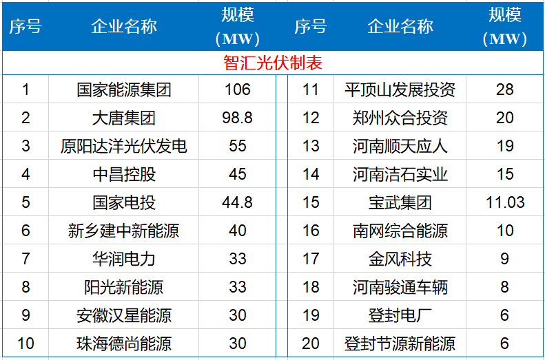 6月21日,河南發(fā)改委之前下發(fā)的《關(guān)于2021年風(fēng)電、光伏發(fā)電項目建設(shè)有關(guān)事項的通知》(豫發(fā)改新能源〔2021〕776),對2021年的風(fēng)電、光伏項目開展進(jìn)行了安排。(詳見《河南:分布式不限規(guī)模,暫停集中光伏電站申報》)9月18日,河南省發(fā)改委下發(fā)了《關(guān)于下達(dá)2021年風(fēng)電項目開發(fā)方案的通知》,下發(fā)了404萬千瓦風(fēng)電項目清單。(詳見《4GW風(fēng)電入圍河南名單,大唐、國電投、明陽、華潤、特變規(guī)模最大!》)。此次河南省下發(fā)的647.63MW光伏項目名單中,國家能源集團(tuán)獲得106MW,規(guī)模最大;其次為大唐集團(tuán),獲得98.8MW。各項目業(yè)主獲得的規(guī)模如下表所示。