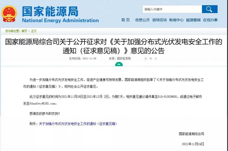 關(guān)于加強(qiáng)分布式光伏發(fā)電安全工作的通知(征求意見(jiàn)稿)