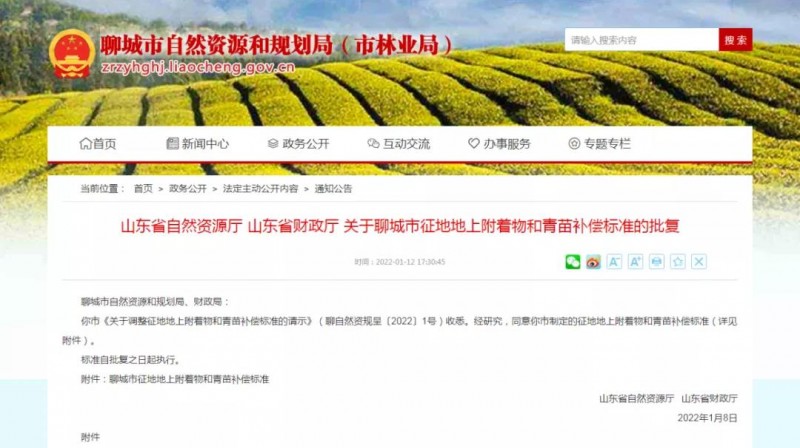 你市《關于調整征地地上附著物和青苗補償標準的請示》(聊自然資規呈〔2022〕1號)收悉。經研究,同意你市制定的征地地上附著物和青苗補償標準(詳見附件)。