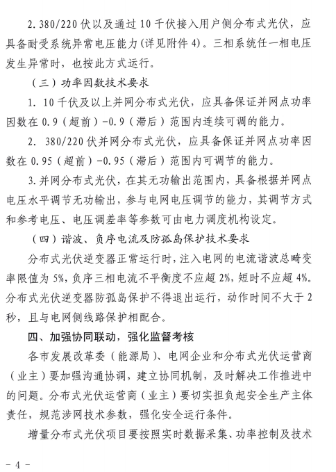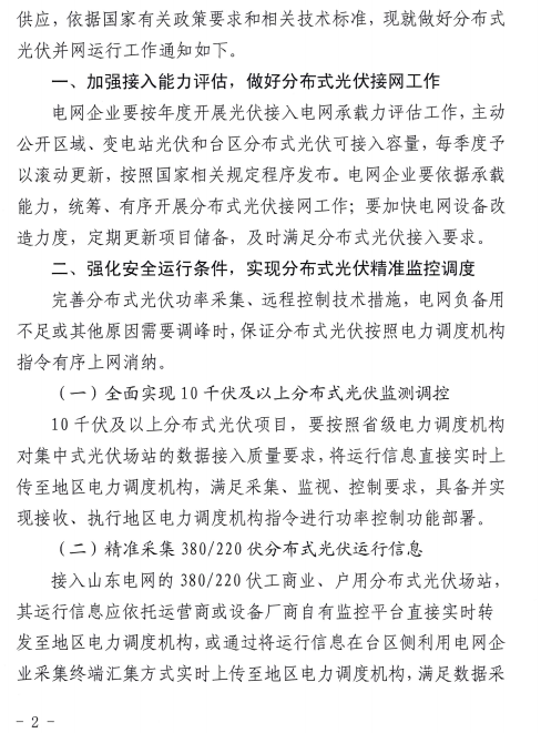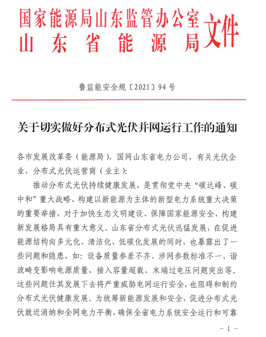 近日,國(guó)家能源局山東監(jiān)管辦公室山東省能源局發(fā)布關(guān)于切實(shí)做好分布式光伏并網(wǎng)運(yùn)行工作的通知,通知指出四點(diǎn),一、加強(qiáng)接入能力評(píng)估,做好分布式光伏接網(wǎng)工作;二、強(qiáng)化安全運(yùn)行條件,實(shí)現(xiàn)分布式光伏精準(zhǔn)監(jiān)控調(diào)度;三、規(guī)范涉網(wǎng)技術(shù)參數(shù),保證分布式光伏并網(wǎng)性能;四、加強(qiáng)協(xié)同聯(lián)動(dòng),強(qiáng)化監(jiān)督考核。