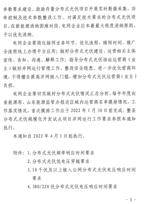 值得注意的是,首次摸排工作應(yīng)于2022年1月30前完成,整縣分布式光伏規(guī)模化開發(fā)試點(diǎn)項(xiàng)目并網(wǎng)運(yùn)行工作要求參照本通知執(zhí)行。本通知自2022年4月1日起執(zhí)行。