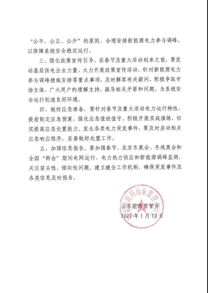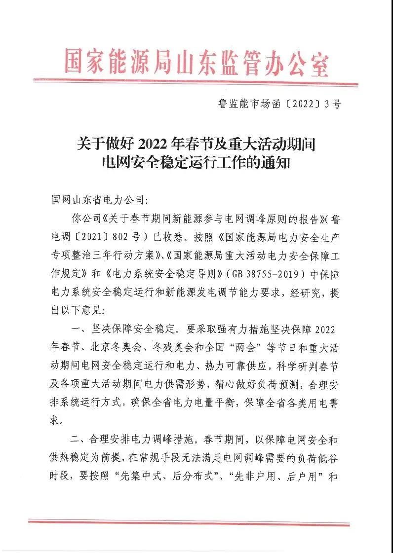 根據(jù)文件,要合理安排電力調(diào)峰措施。春節(jié)期間,以保障電網(wǎng)安全和供熱穩(wěn)定為前提,在常規(guī)手段無(wú)法滿(mǎn)足電網(wǎng)調(diào)峰需要的負(fù)荷低谷時(shí)段,要按照“先集中式、后分布式”、“先非戶(hù)用、后戶(hù)用”和“公平、公正、公開(kāi)”的原則,合理安排新能源電力參與調(diào)峰,以保障系統(tǒng)安全穩(wěn)定運(yùn)行。