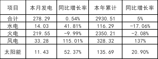 (一)發(fā)電量情況。12月份當月,全省發(fā)電量278.29億千瓦時,同比加0.54%。其中水電14.03億千瓦時,同比增長41.81%;火電219.55億千瓦時,同比減少9.99%;風電33.28億千瓦時,同比增長115.01%;太陽能11.43億千瓦時,同比增長52.37%。