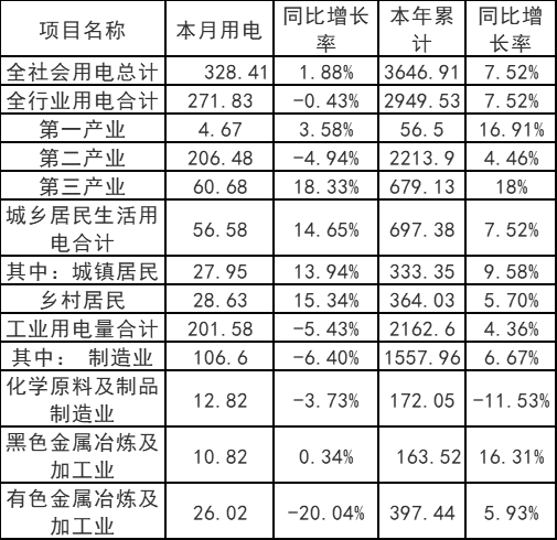 (一)全社會用電量情況。全省全社會用電量328.41億千瓦時,同比增加1.88%;累計用電量3646.91億千瓦時,同比增加7.52%。