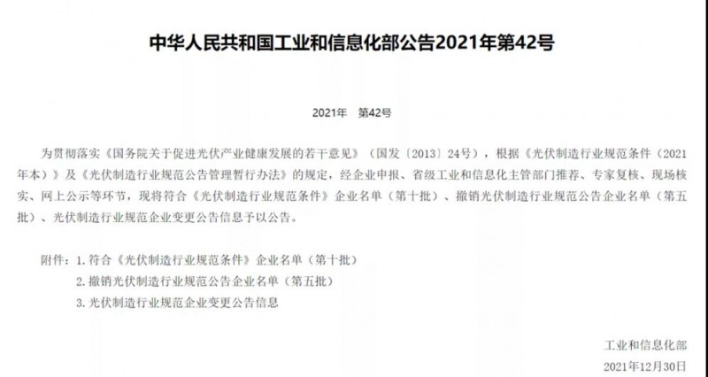 《光伏制造行業規范條件》是國家工業和信息化部為落實國務院24號文出臺的行業規范性文件,是中國光伏制造行業規范的方向標,旨在進?步加強和完善光伏制造行業管理,促進光伏產業結構調整和轉型升級。2022年,“整縣推進”工作將是國內光伏市場的重頭戲,如何選好產品、配好型?如何保證電站的穩定運行及業主的高收益?對逆變器、多晶硅、電池、組件等有著更高的衡量標準及要求,《光伏制造行業規范條件》在其中扮演著重要的角色,設置了?道無形的“實力門檻”,對于中國光伏市場健康、科學發展起著至關重要的作用。
