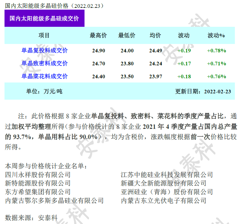 本周硅料價格延續微漲走勢,其中單晶復投料、單晶致密料、單晶菜花料成交均價漲幅在0.7%-0.8%。本周絕大多數多晶硅企業開始簽訂3月份長單,且成交價普遍小幅上漲1-2元/公斤,除長單外,也有部分企業簽訂散單,價格漲幅相對較大。本周硅料價格繼續持穩微漲,主要是由于3月份長單基本集中在本周和下周簽訂,價格取決于3月份硅料市場供需情況、各環節庫存承受力、市場情緒等各方面因素,而其中最根本的影響因素仍是供需,3月份預計國內多晶硅擴產增量釋放不及預期,海外個別多晶硅企業分線檢修仍未結束,而硅片企業開工率及產出均有提升計劃,預計硅料供應缺口將在2000-3000噸,故本周開始簽訂的3月份長單價延續小幅上漲的走勢。