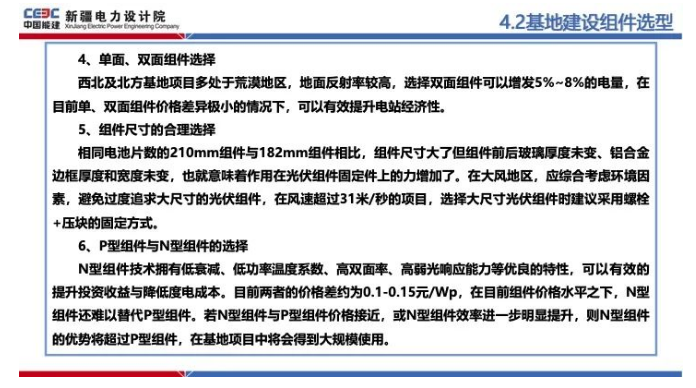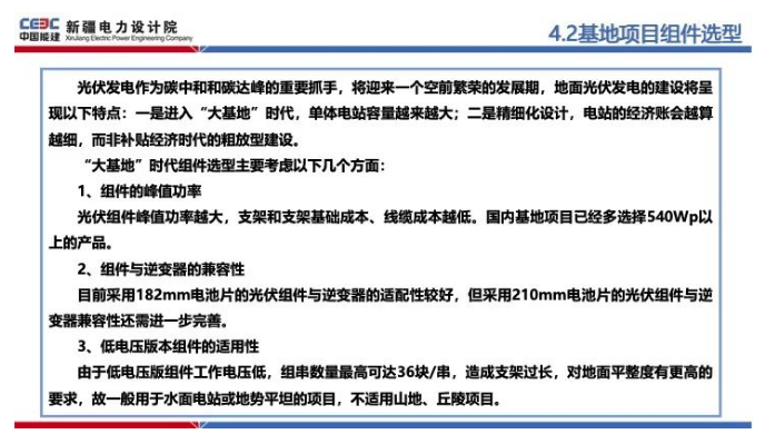 中國能建新疆電力設計院表示,“大基地”時代組件選型主要考慮以下幾個方面: