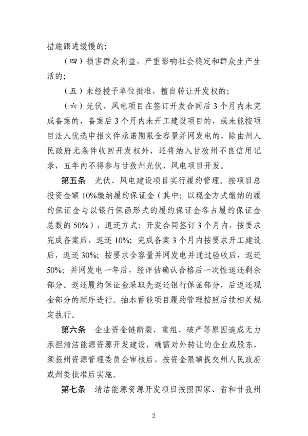 (六)光伏、風電項目在簽訂開發合同后3個月內未完成備案的,備案后3個月內未開工建設項目的,或未能按項目法人優選申報文件承諾期限全容量并網發電的,除由州人民政府無條件收回開發權外,還將納入甘孜州不良信用記錄,五年內不得參與甘孜州光伏、風電項目開發。