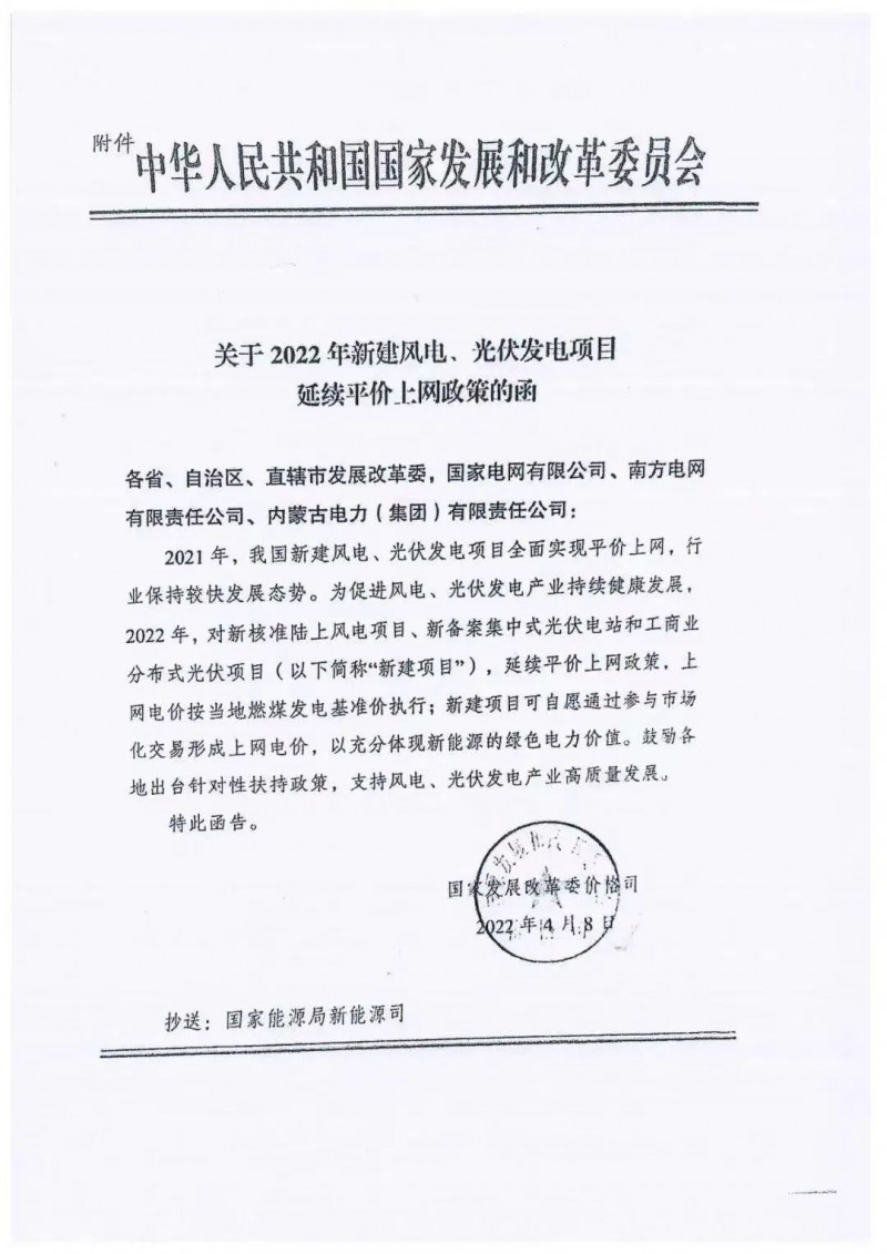 國家發改委價格司發布的《關于2022年新建風電、光伏發電項目延續平價上網政策的函》指出,2021年,我國新建風電、光伏發電項目全面實現平價上網,行業保持較快發展態勢。為促進風電、光伏發電產業持續健康發展,2022年,對新核準陸上風電項目、新備案集中式光伏電站和工商業分布式光伏項目(以下簡稱“新建項目”),延續平價上網政策,上網電價按當地燃煤發電基準價執行。新建項目可自愿通過參與市場化交易形成上網電價,以充分體現新能源的綠色電力價值。鼓勵各地出臺針對性扶持政策,支持風電、光伏發電產業高質量發展。