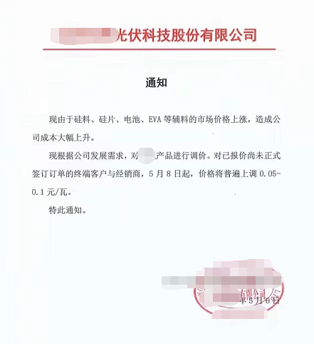 值得一提的是,近日,某光伏企業(yè)也發(fā)布組件漲價公告,公告稱:由于硅料、硅片、電池、EVA等輔料的市場價格上漲,造成成本大幅上升。現(xiàn)根據(jù)公司發(fā)展需求,對公司產(chǎn)品進(jìn)行調(diào)價。對已報價尚未正式簽訂訂單的終端客戶與經(jīng)銷商,5月8日起,價格將普遍上漲0.05-0.1元/W。
