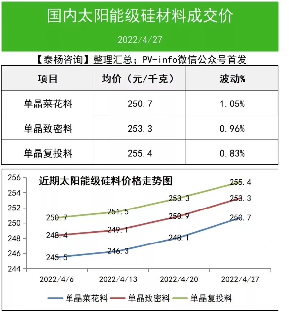 國內(nèi)單晶復(fù)投料價格區(qū)間在252-260元/kg,成交均價為255.4元/kg;單晶致密料價格區(qū)間在250-258元/kg,成交均價為253.3元/kg;單晶菜花料價格區(qū)間在248-255元/kg,成交均價為250.7元/kg。