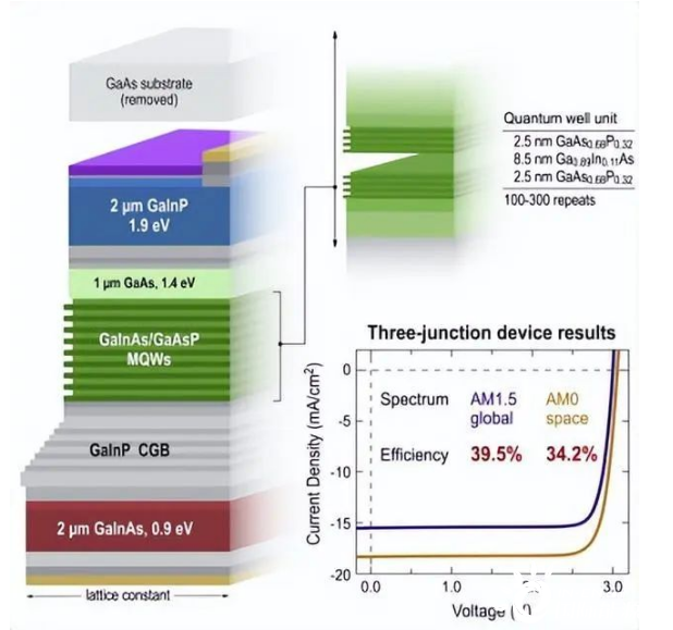 這種新型太陽能電池建立在一種稱為倒置變質(zhì)多結(jié)(IMM)電池的架構(gòu)上。它具有響應(yīng)光產(chǎn)生電流的三個(gè)組件。重要的是,這些結(jié)中的每一個(gè)都由不同的材料構(gòu)成:頂部是磷化鎵銦,中心是砷化鎵,底部是砷化鎵銦。它們能夠吸收各種波長,因此電池可以從整個(gè)光譜中捕獲更多能量。