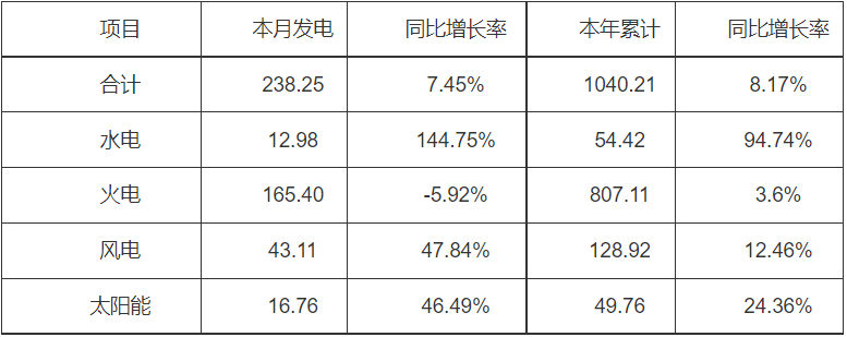 (一)發電量情況。4月份當月,全省發電量238.25億千瓦時,同比增加7.45%。其中水電12.98億千瓦時,同比增長144.75%;火電165.40億千瓦時,同比減少5.92%;風電29.16億千瓦時,同比增加47.84%;太陽能16.76億千瓦時,同比增長46.49%。