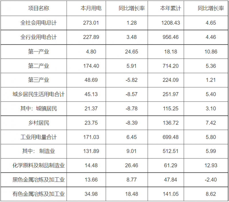 (一)全社會用電量情況。全省全社會用電量273.01億千瓦時,同比增加1.28%;累計用電量1208.43億千瓦時,同比增加4.65%。
