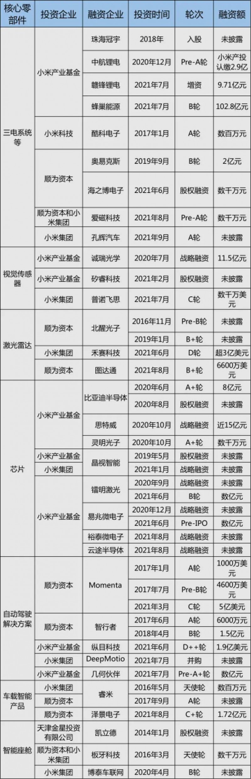 截至目前,包括雷軍個人的天使投資機構順為創業、小米集團、小米產投、順為資本這幾家投資機構,已先后投資了近40家汽車產業鏈企業,涵蓋智能駕駛、車載芯片、動力電池等眾多產業鏈核心技術領域。