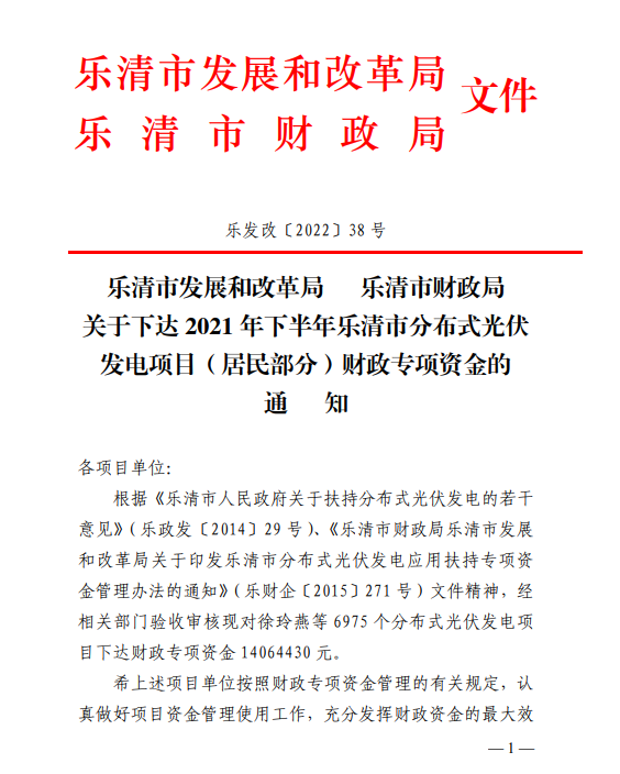 根據《樂清市人民政府關于扶持分布式光伏發電的若干意見》(樂政發〔2014〕29號)、《樂清市財政局樂清市發展和改革局關于印發樂清市分布式光伏發電應用扶持專項資金管理辦法的通知》(樂財企〔2015〕271號)文件精神,經相關部門驗收審核現對徐玲燕等6975個分布式光伏發電項目下達財政專項資金14064430元。