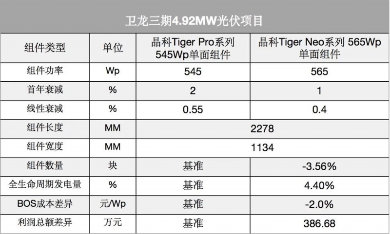 通過對(duì)比N型Tiger Neo 565Wp單面組件和P型Tiger Pro 545Wp單面組件,結(jié)果顯示:在高電池轉(zhuǎn)換效率、高發(fā)電量、低衰減率、低溫度系數(shù)等多重優(yōu)勢(shì)作用下,Tiger Neo 565Wp單面組件全生命周期下,運(yùn)行期內(nèi)利潤(rùn)可增加約386.68萬(wàn)元(以0.83元/度上網(wǎng)電價(jià)計(jì)算),為客戶帶來(lái)更高利潤(rùn)。