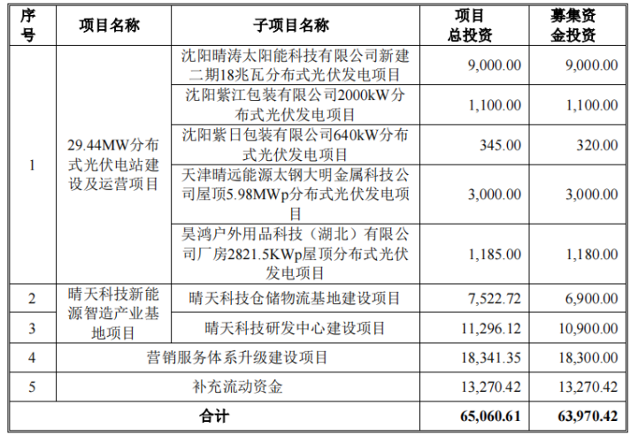 根據(jù)招股書顯示,晴天科技此次募資總投資額65060.61萬元,募集資金擬投入金額為63970.42萬元。主要用于分布式光伏電站、新能源智造產業(yè)基地項目以及營銷服務體系升級建設項目。