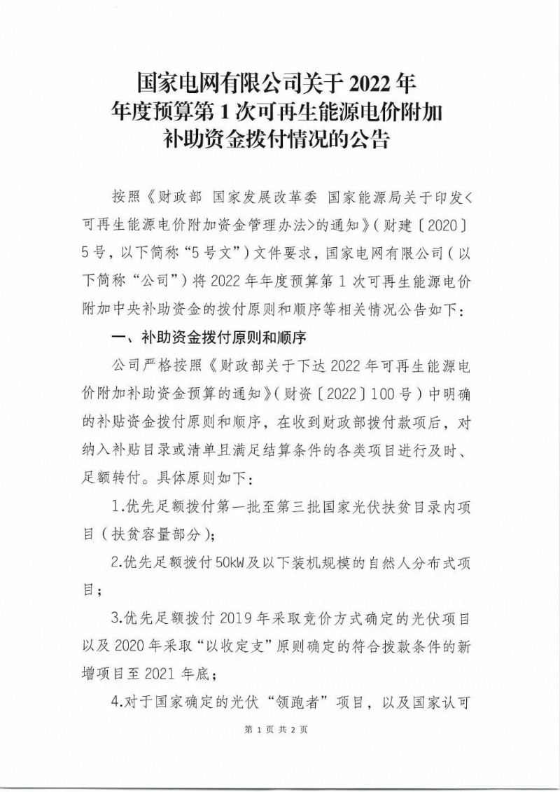 7月15日,國家電網公司發布《國家電網有限公司關于2022年年度預算第1次可再生能源電價附加補助資金撥付情況的公告》,發布2022年第一批補貼資金!