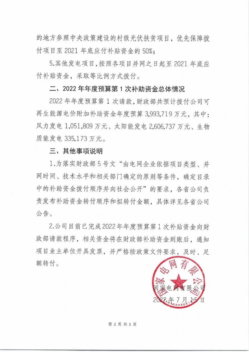 文件指出:2022年年度預算第1次請款,財政部共預計撥付公司可再生能源電價附加補助資金年度預算3,993,719萬元,其中:風力發電1,051,809萬元、太陽能發電2,606,737萬元、生物質能發電335,173萬元。向財政部請款程序,相關資金將在財政部補助資金到賬后,通知項目業主單位開具發票,并嚴格按政策文件要求,及時、足額轉付。