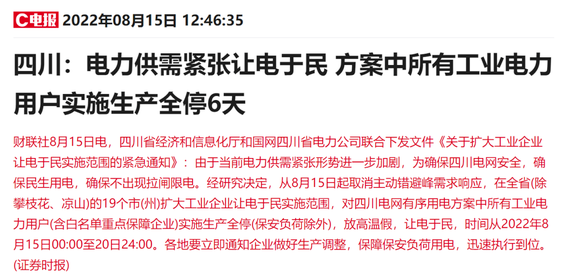聯(lián)系到8月15日,四川省經濟和信息化廳和國網四川省電力公司聯(lián)合下發(fā)文件《關于擴大工業(yè)企業(yè)讓電于民實施范圍的緊急通知》,要求對四川電網有序用電方案中所有工業(yè)電力用戶(含白名單重點保障企業(yè))實施生產全停(保安負荷除外),放高溫假,讓電于民。