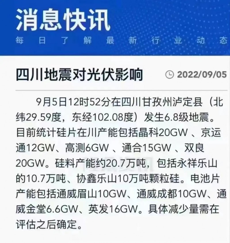 另?yè)?jù)隆眾資訊數(shù)據(jù)顯示,目前統(tǒng)計(jì)硅片在川產(chǎn)能包括晶科20GW、京運(yùn)通12GW、高測(cè)6GW、通合15GW、雙良20GW。硅料產(chǎn)能約20.7萬(wàn)噸,包括永祥樂(lè)山的10.7萬(wàn)噸、協(xié)鑫樂(lè)山10萬(wàn)噸顆粒硅。電池片產(chǎn)能包括通威眉山10GW、通威成都10GW、通威金堂6.6GW、英發(fā)16GW。具體減少量需在評(píng)估之后確定。