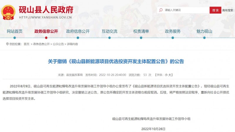 據相關人士透露,硯山縣項目優選撤銷原因系項目前期招標程序不符合相關政府部門要求,因此決定撤銷原公告及原公告所確定的開發主體資格,并于10月27日或28日重新發布優選公告,新公告要求競標企業11月1日前完成競標材料提交,11月2日開展后續工作。