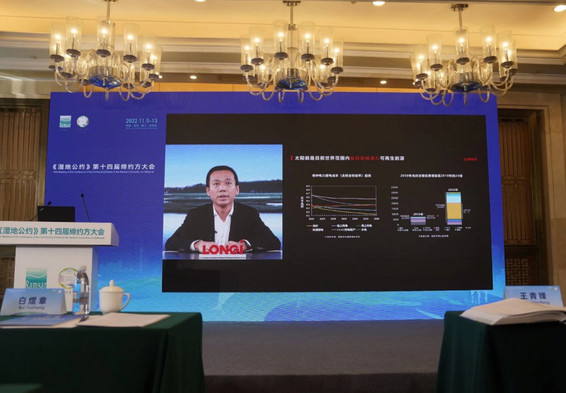 在邊會上,隆基綠能系統(tǒng)解決方案部副總裁倪久建以視頻形式作“光伏推動生態(tài)保護 共建零碳未來”的主題演講,與濕地、林草領(lǐng)域的多位專家學(xué)者共同探討光伏與生態(tài)的結(jié)合,以及對生態(tài)、濕地的保護價值,為濕地保護與修復(fù)貢獻智慧、建言獻策。