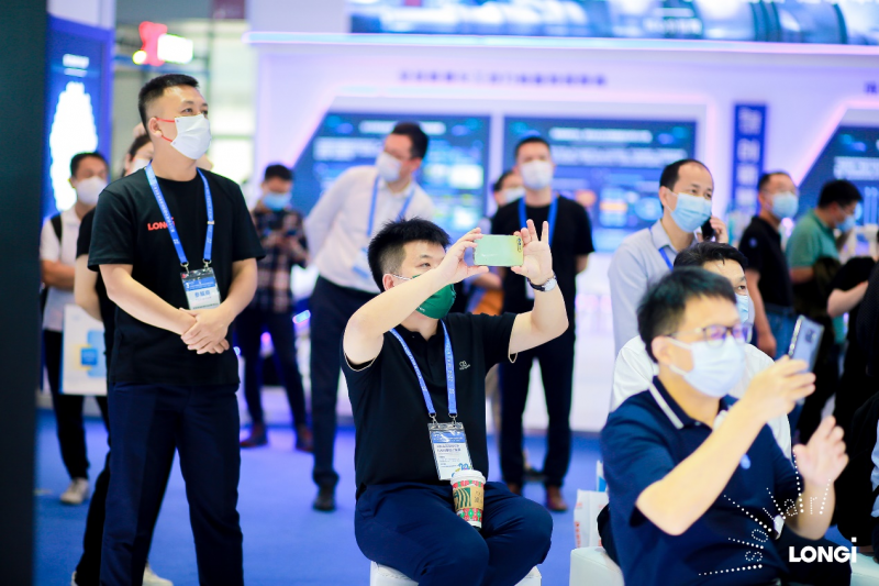 全新一代光伏組件產品Hi-MO 6及其他Hi-MO系列產品、基于不同場景解決方案下的BIPV產品、“綠電+綠氫”的綜合解決方案,吸引了諸多互聯網及其他科技領域的觀眾和從業者的圍觀,這是很多人第一次真實觸摸到組件產品,對“每一寸都發電”的光伏產業引發了巨大的好奇和想象。“原來硬件制造背后還有這么多的黑科技,大型地面電站中的組件陣列也可以排布出如畫的藝術美感。”現場觀眾感嘆到。