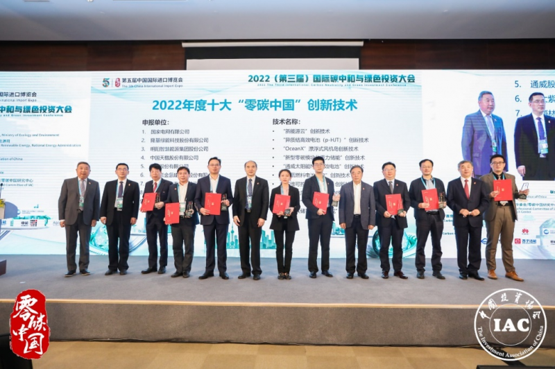 技術創新是實現碳達峰、碳中和的核心驅動力,“零碳中國”行動高度重視、支持和推廣優秀的零碳創新技術。在大會上,中國投資協會能源投資專委會張杰秘書長發布了2022年度十大“零碳中國”創新技術,隆基綠能以“異質結高效電池創新技術”獲得該項殊榮。